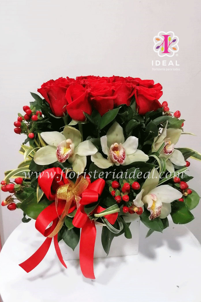 Arreglo floral elaborado en rosas, orquideas, impérico, canciones de la india y moño, incluye tarjeta para la ocasión
