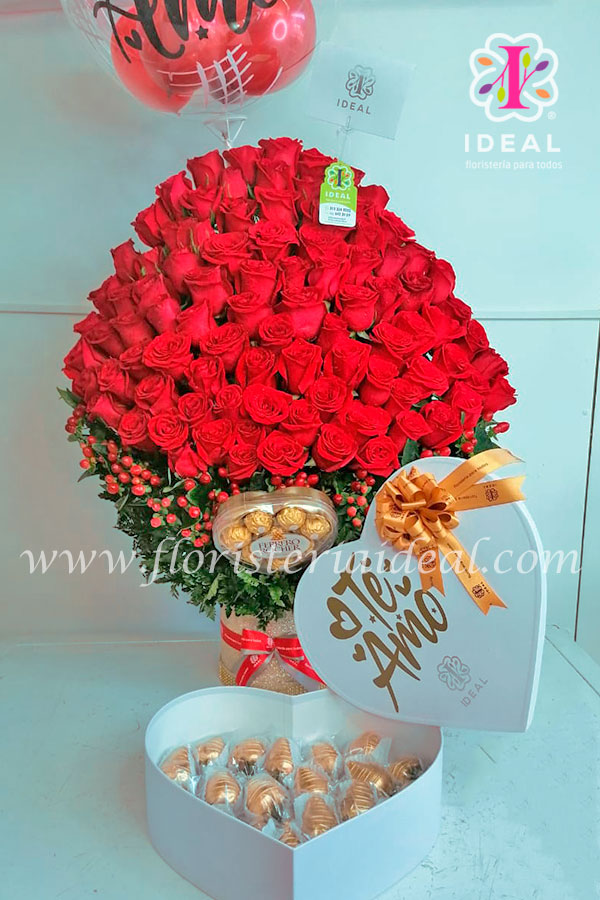 Gran ramo de rosa acompañado de deliciosos chocolates ferrero y ricas fresas de chocolate.
