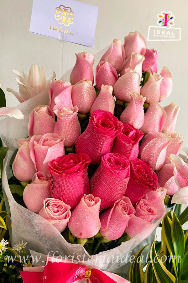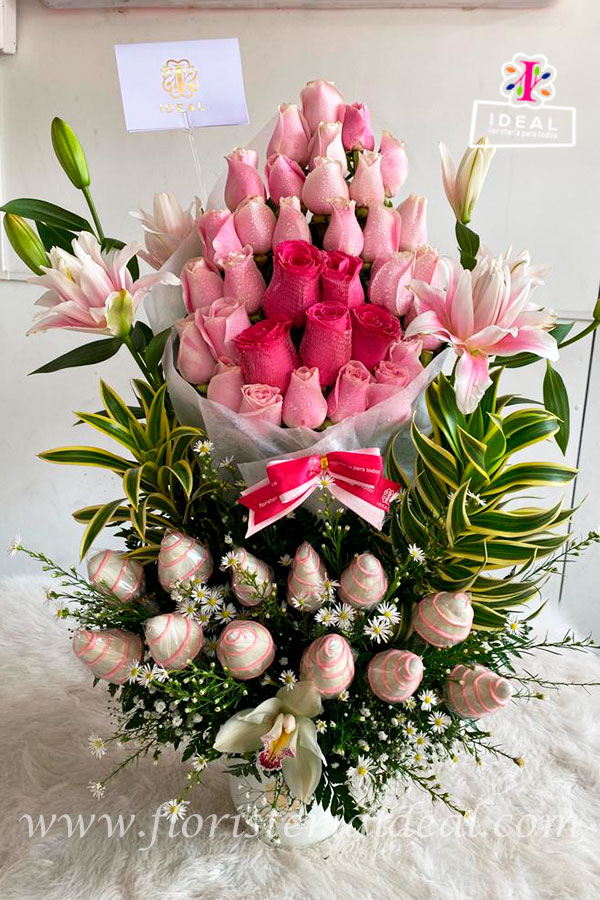 Lindo ramo floral en rosas hermosas acompañado de fresas cubiertas de chocolate y tarjeta con mensaje deseado para la ocasión.