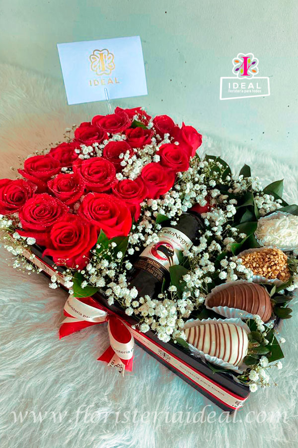 Delicada caja floral con rosas y fresas cubiertas de chocolate y botella de vino su respectiva tarjeta con mensaje deseado .