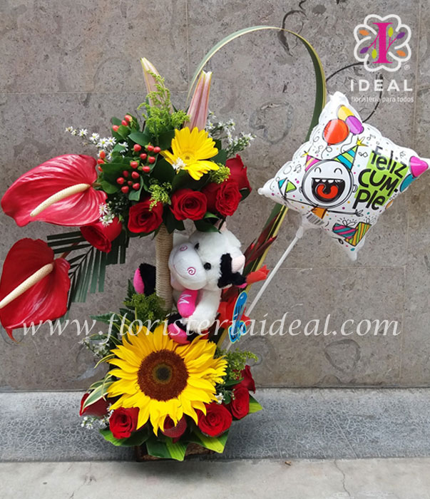 lindo arreglo floral elborado en bellas flores surtidas acompañado de tierno peluche y hermoso globito inclute tarjeta a computador para la ocasion.
