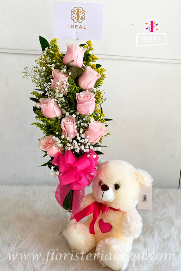 Hermoso solitario en base de vidrio y lindas rosas con follajes ,moño decorativo , tierno peluche y tarjeta con mensaje deseado para la ocasión .