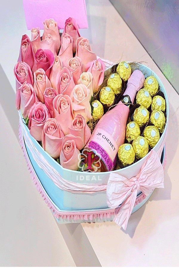Delicado arreglo floral acompañado de vino espumoso chenet, incluye chocolates Ferrero Rocher y tarjeta para la ocasión