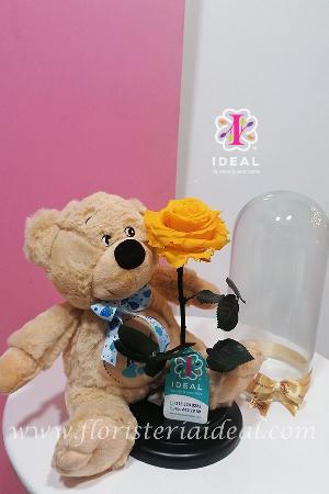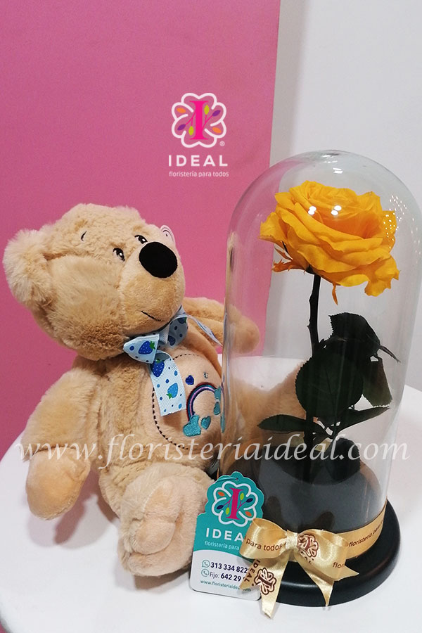Delicada rosas preservada con capacidad de duración de dos a tres años acompañada de tierno oso de peluche.