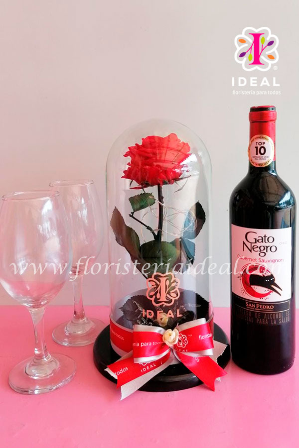 Linda rosa preservada roja, acompañada de exclusivo vino gato negro y 2 copas incluye tarjeta para la ocasión.