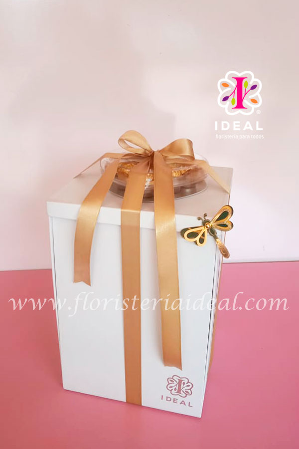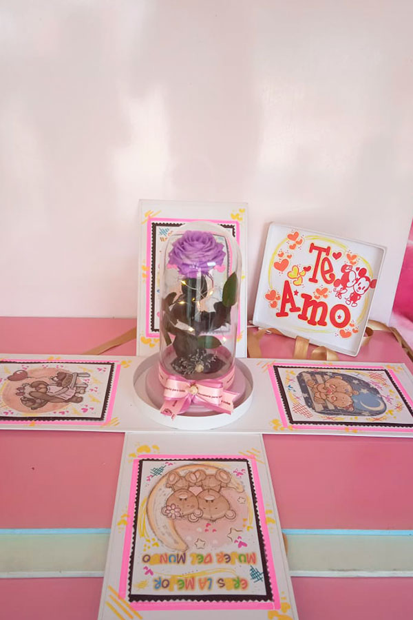 Bella rosa inmortalizada decorada en caja sorpresa personalizada acompañada de chocolate ferrero y tarjeta para la ocasión.
