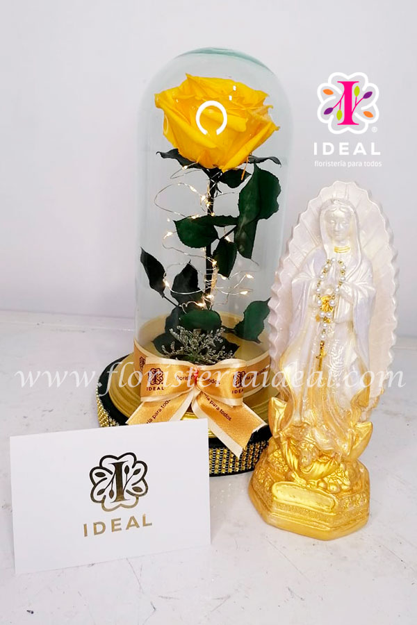 Delicada Rosa Preservada, acompañado de delicada virgen, luz led y tarjeta para la ocasión.