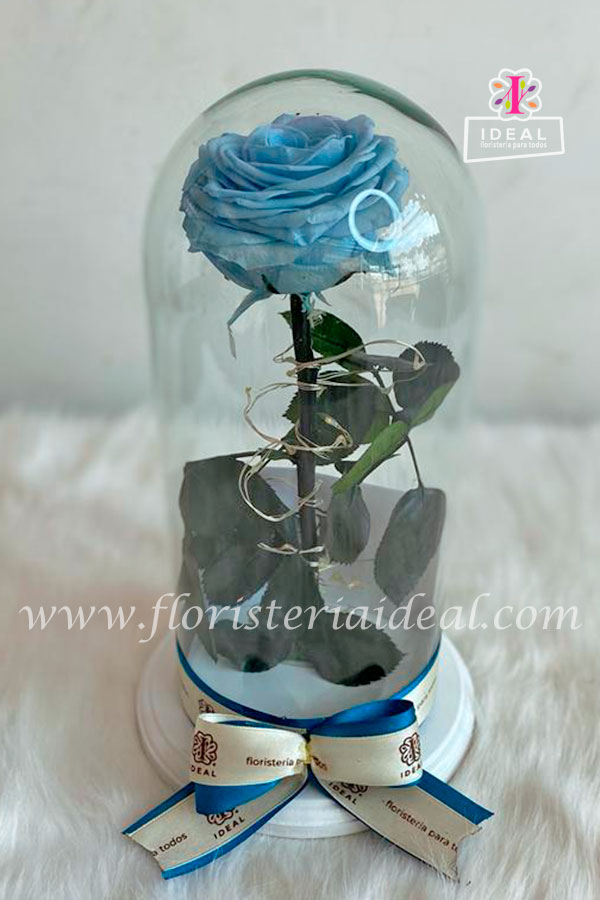 Linda rosa preservada color celeste acompañada de luz led y tarjeta para la ocasión