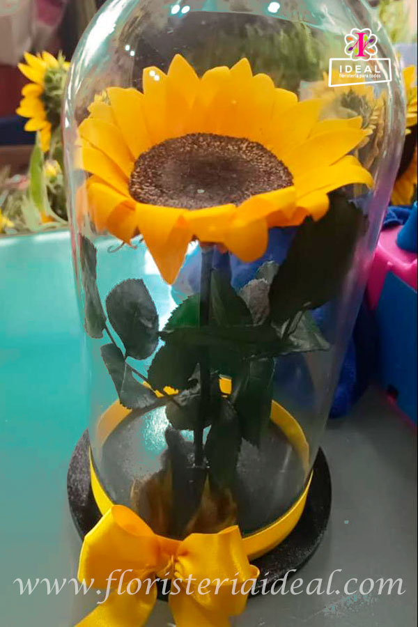 Lindo y delicado girasol preservado acompañado de base de vidrio tipo cúpula y base de madera mas luz led y tarjeta con mensaje para la ocasión.
