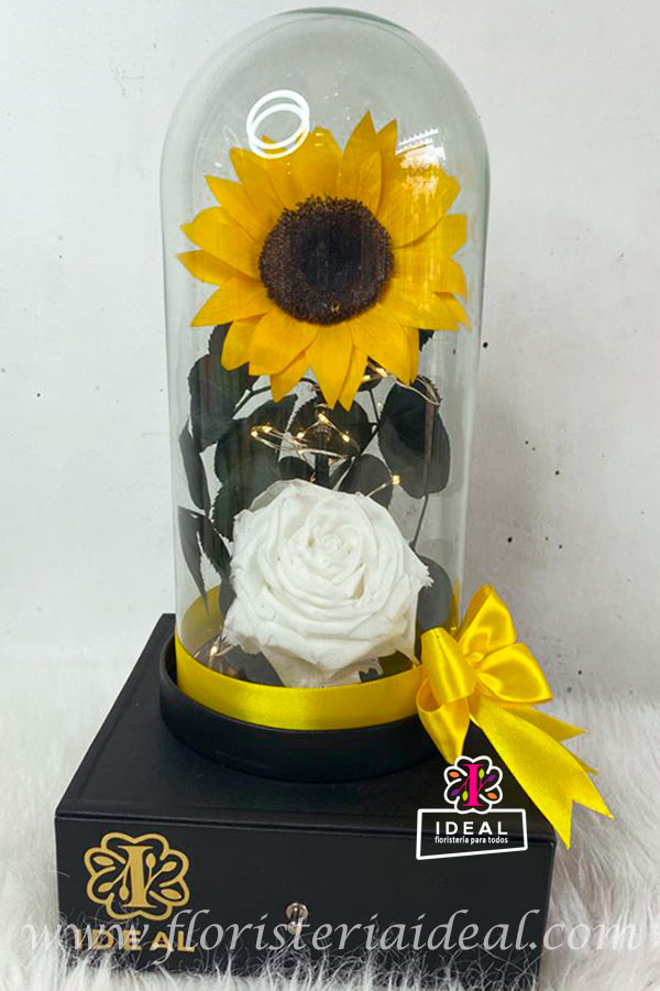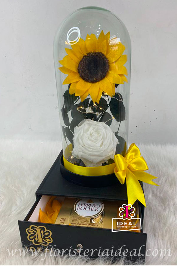 Hermoso girasol preservado símbolo del Sol, el amor y la admiración, acompañado de una bella rosa blanca inmortalizada representación de pureza, amistad y confianza, mas delicioso chocolate ferrero x4, y tarjeta personalizada para la ocasión.