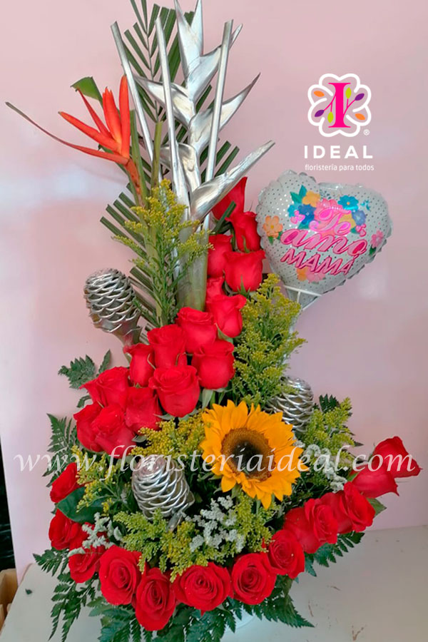 Delicado arreglo floral tipo exótico elaborado en variedad de flores tropicales como rosas rojas , girasoles y otras acompañado de globo metalizado pequeño y tarjeta para la ocasión.