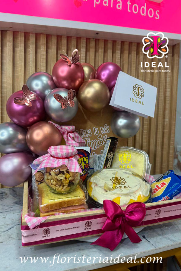 delicioso desayuno sorpresa -sándwich de pollo - ensalada de frutas -jugo de naranja -frutos secos -avena fitness -postre -gala - decoración en globos