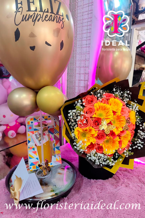 deliciosa bandeja con 4 compartimentos y un jugo viene a la par con un hermoso arreglo de mano en gerveras