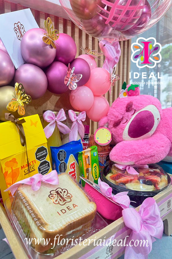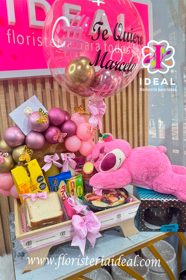 Hermoso desayuno sorpresa de oso lotso, con globo burbuja, y arco de globos mini. Menú Sándwich de pollo Jugo de naranja Jugo de milo Ensalada de futas Mini torta Gala Bonyurt Maní Galleta tosh Postre alpina Chocolates maxti café