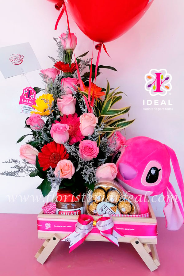 Delicado arreglo floral elaborado en bellas rosas, acompañado de peluche de stick , globos en helio, chocolate ferrero rocher, nutela y tarjeta para la ocasión.