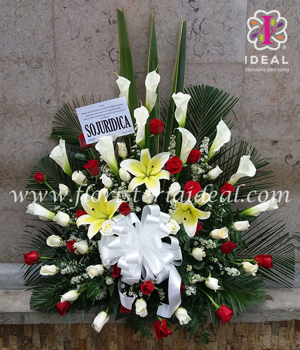 acompaña tus sentidas condolencias con este lindo arreglo floral decorado con lindos cartuchos y bellas rosas y tiernos lirios.