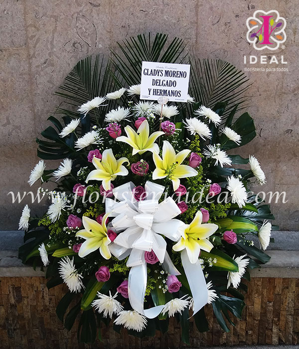 bello arreglo floral elaborado con bellos crisantemos,rosas y lirios acompañado de follajes verdes y tarjeta con mensaje para ocasion.