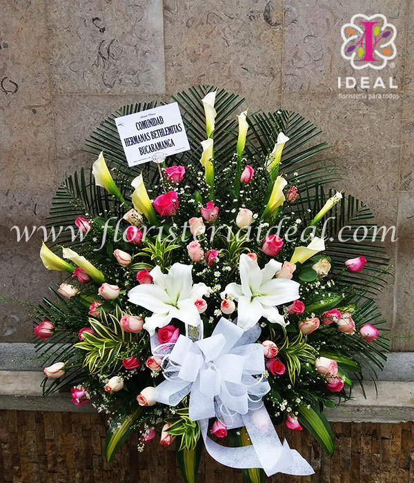 expresa tu sentidas condolencias con este bello arreglo floral elaborado con rosas,cartuchos,lirios y bellos follajes incluye tarjeta con mensaje de condolencia