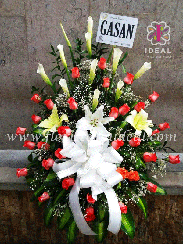 Delicado arreglo de condolencia esta elaborado en hermosos cartuchos,rosas,lirios y follajes verdes y blancos