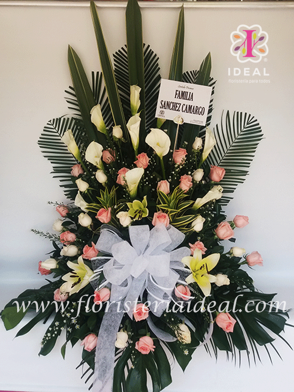 Bello y delicado arreglo floral especial para acompañar tus mas sentidas condolencias esta elaborado en cartucho, rosas, lirios y bellos follajes incluye su tarjeta para la ocasion.