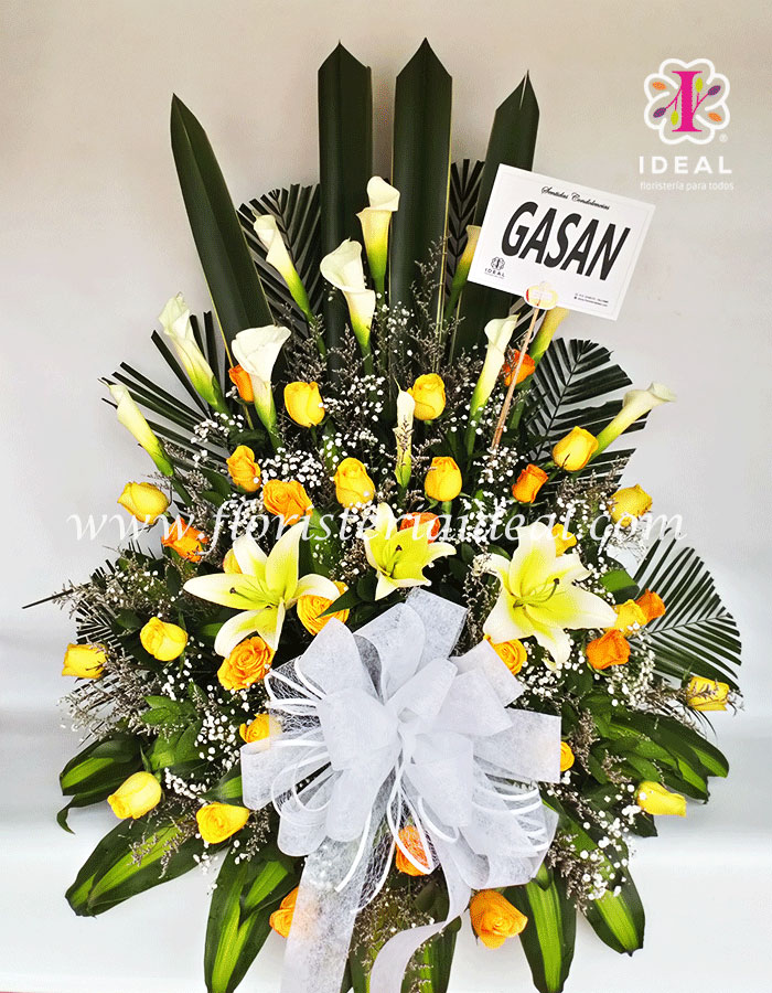 Delicado arreglo floral elaborado con hermosos cartuchos,rosas,lirios y bellos follajes especial para acompa?ar tus mas sentidas condolencias.
