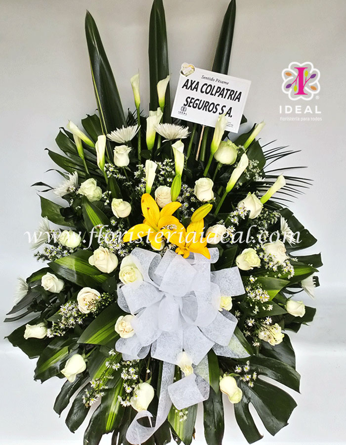 Acompa?a tus sentidas condolencias con este delicado arreglo floral elaborado con bellos cartucho, rosas, lirios y delicados follajes.