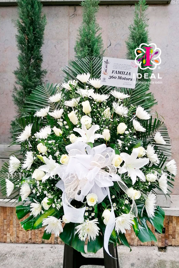 ARREGLO DE CONDOLENCIAS ELABORADO CON ROSAS BLANCAS, CRISANTEMOS, LIRIOS, INCLUYE TARJETA PERSONALIZADA.