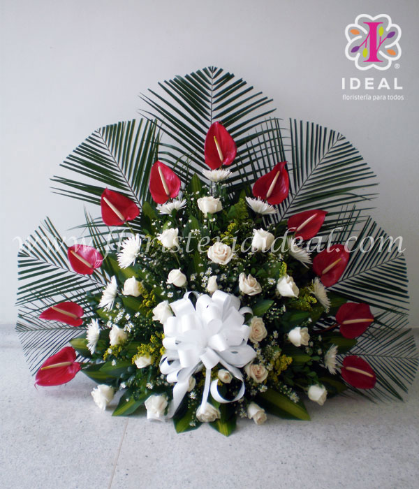 Arreglo floral fúnebre creado con anturios, crisantemos y rosas.