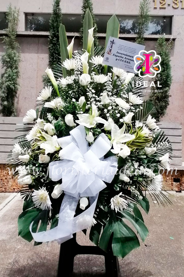 ARREGLO DE CONDOLENCIAS ELABORADO CON ROSAS BLANCAS, CRISANTEMOS, LIRIOS, INCLUYE TARJETA PERSONALIZADA.