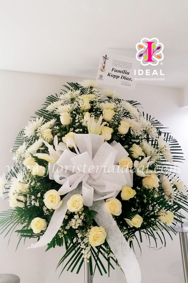 ARREGLO DE CONDOLENCIAS ELABORADO CON ROSAS BLANCAS , CRISANTEMOS, LIRIOS, INCLUYE TARJETA PERSONALIZADA.