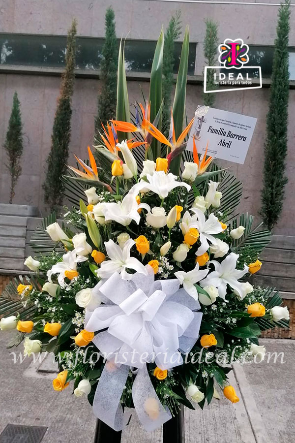 Delicado arreglo floral elaborado en bellas rosas amarillas y delicados lirios, acompañado de lindos follajes. Especial para condolencias.