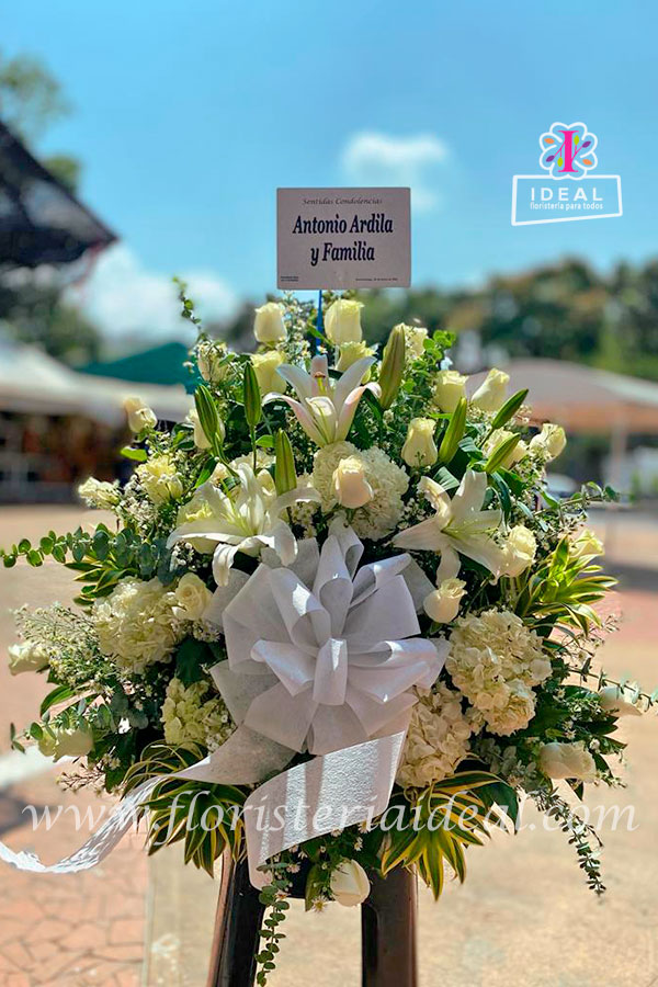 Abanico fúnebre elaborado en rosas blancas, hortensia blanca y lirios blancos, acompañado de moño decorativo y tarjeta personalizada.