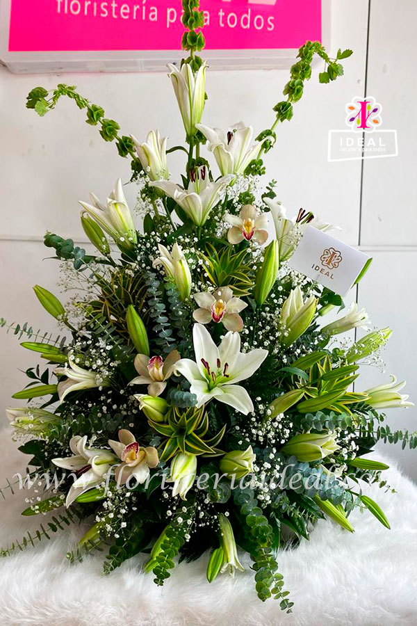 Arreglo floral elaborado en delicados Lirios, Cymbidium's Campanas de Irlanda y follajes verdes, incluye tarjeta para la ocasión