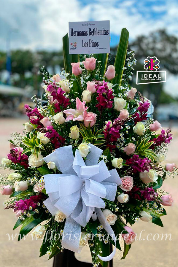 Delicado arreglo floral elaborado en bellas rosas tonos pasteles y lindos follajes acompañado de tarjeta para ocasión especial para acompañar tus mas sentidas condolencias..