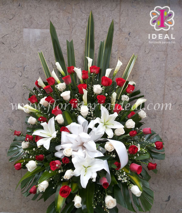 lindo arreglo floral para expresar las mas sentidas condolencias elaborado con bellas flores como. cartuchos,lirios,rosas blancas y rojas acompañado de bellos follajes y tarjeta a compudor..