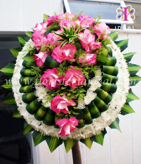 bella corona elaborada en rosas, pon pon crisantemo,y follajes verdes incluye base de pedestal y tarjeta para la ocasión