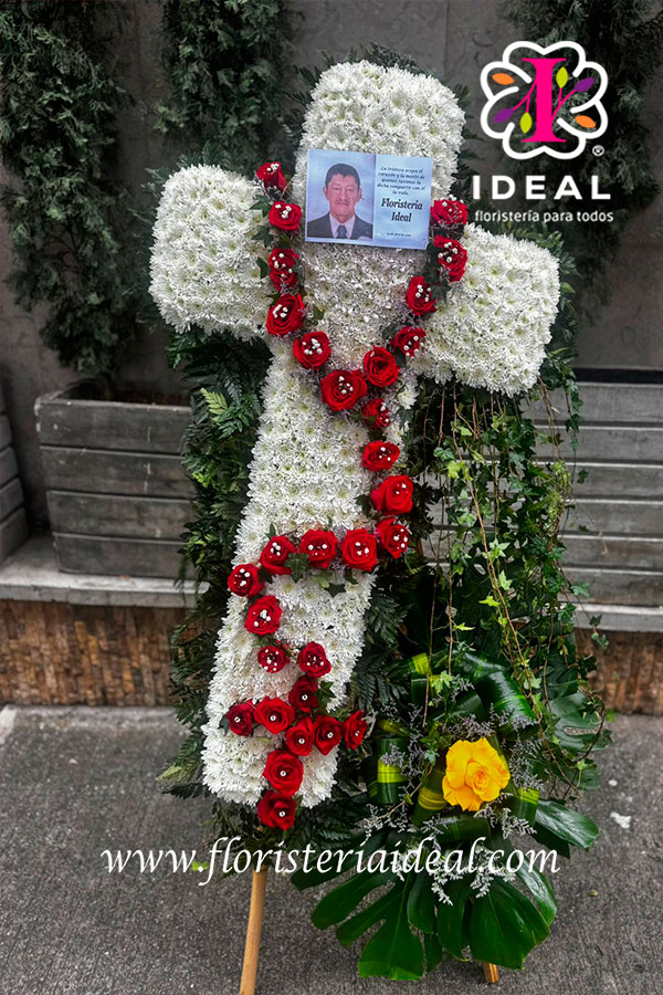 Hermosa corona fúnebre en forma de cruz con un lindo camino de rosas rojas que simulan un hermoso escapulario. Esta echo en una base de pedestal, con pompones blancos, rosas rojas y una cascada en follajes verdes.