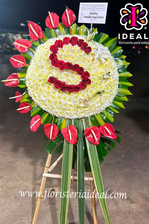 Hermosa corona fúnebre, elaborada en follajes verdes, pompones, anthurios, con una letra personalizada echa en rosas rojas, con una tarjeta personalizada.