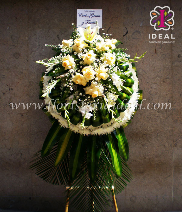 hermosa corona elaborada en bellas rosas, lindos crisantemos y follajes blancos y verdes incluye base de pedestal y tarjeta para le ocasión.