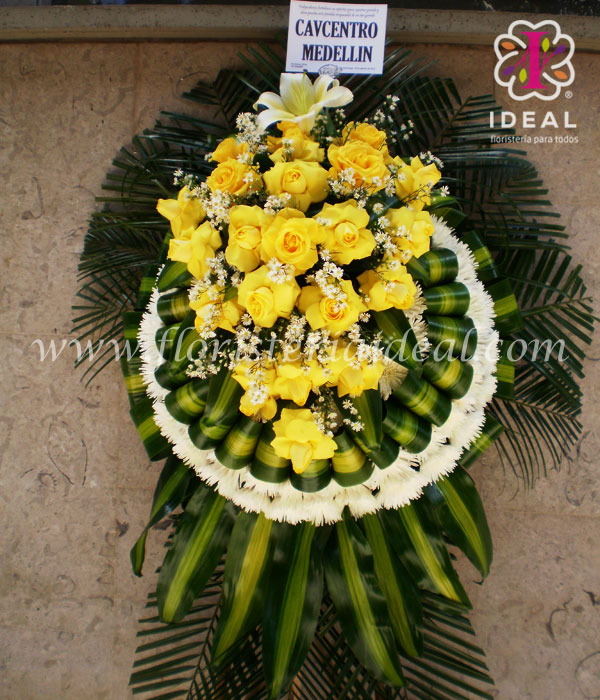 bello arreglo flora en forma de corona elaborada en rosas crisantemos y hermosos follajes verdes lo acompaña una base en pedestal y tarjeta para la ocasión.