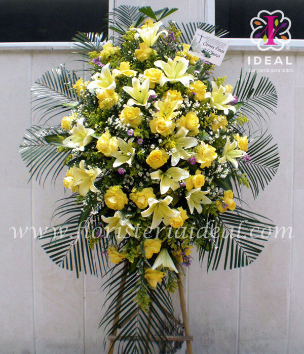 Arreglo de pedestal amarillo, con lirios, rosas, montecasino color lila, palmas rivelinas y follaje