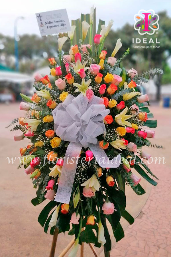 Lindo pedestal elaborado en rosas de colores surtidas acompañado de delicado moño y tarjeta personalizada.