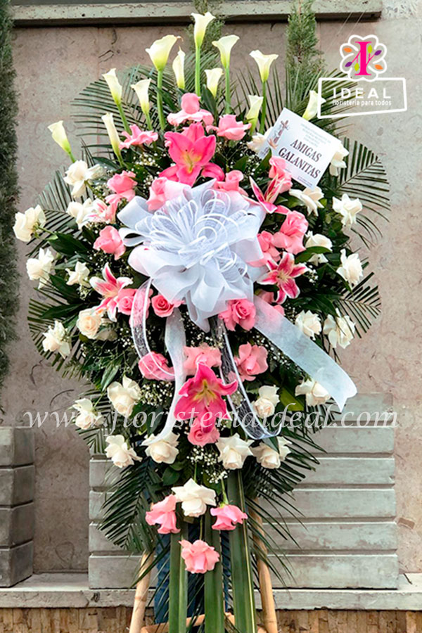 Arreglo floral en forma de pedestal con cartuchos, rosas blancas y rosadas acompañado de delicados lirios y moño blanco