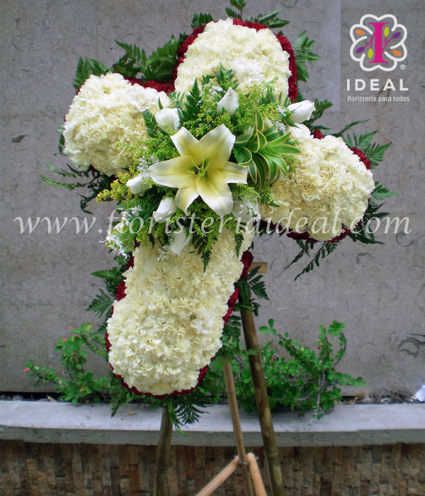 bello arreglo floral elaborado en rosas,lirios,claveles,follajes verdes y blancos esta acompañado de base de pedestal y su forma es una cruz especial para acompañar tus condolencias.