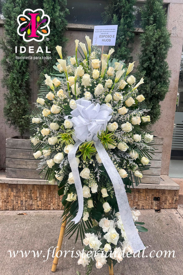 delicado pedestal funebre elaborado en rosa blanca y mas follaje