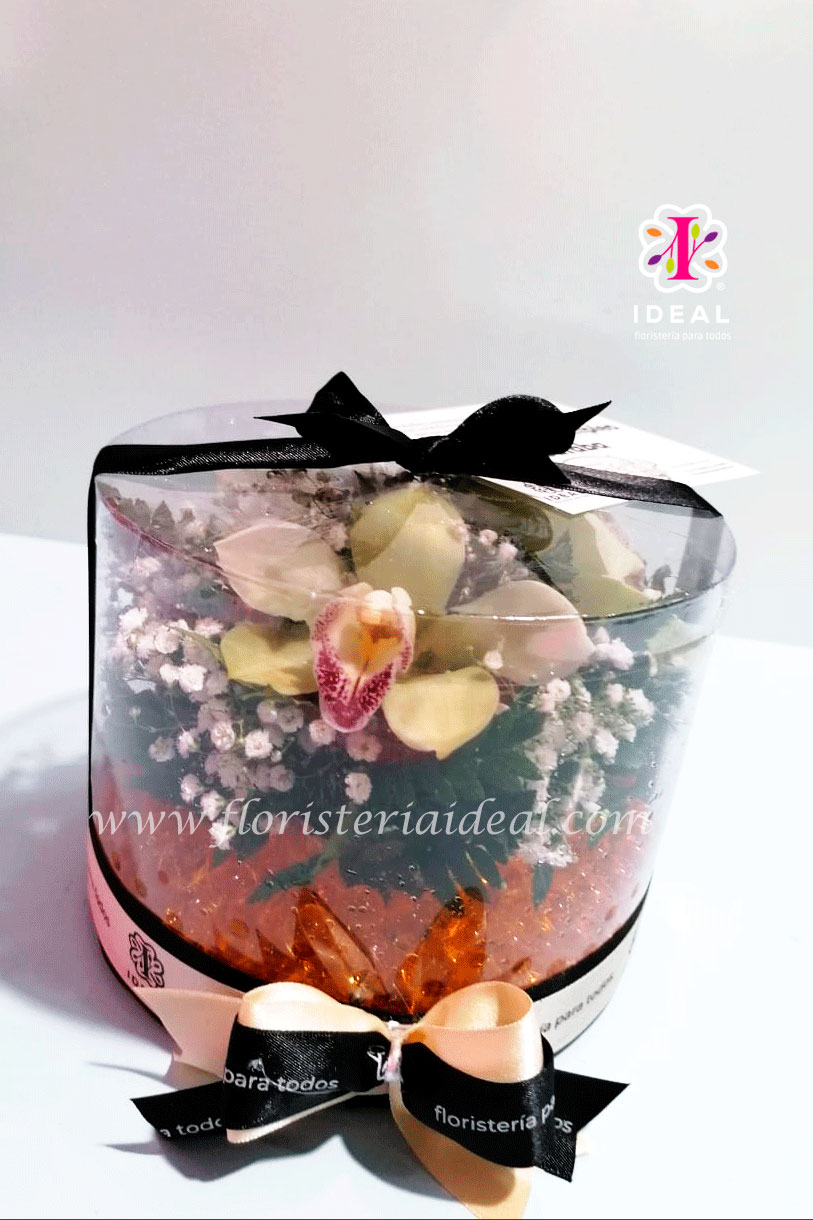 Delicado detalle elaborado en bellas orquídeas y su respectivos follajes su base es una caja de acetato y lo acompaña una tarjeta personalizada.