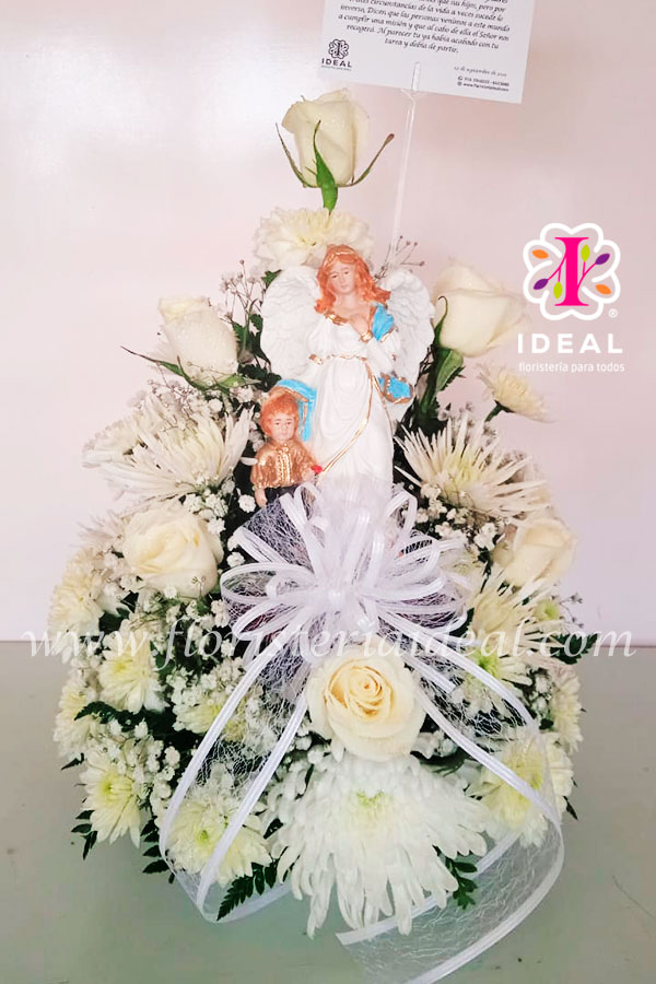 Delicado arreglo floral elaborado en pompones y rosas acompañado de virgen ó angelito y tarjeta para la ocasión