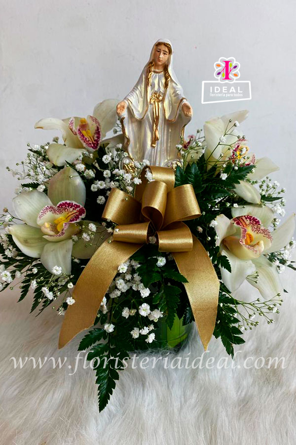 Hermoso arreglo floral de condolencias , elaborado con sinbidios ,follajes e imagen de la virgen además de envase de vidrio , moño decorativo y tarjeta con mensaje deseado .