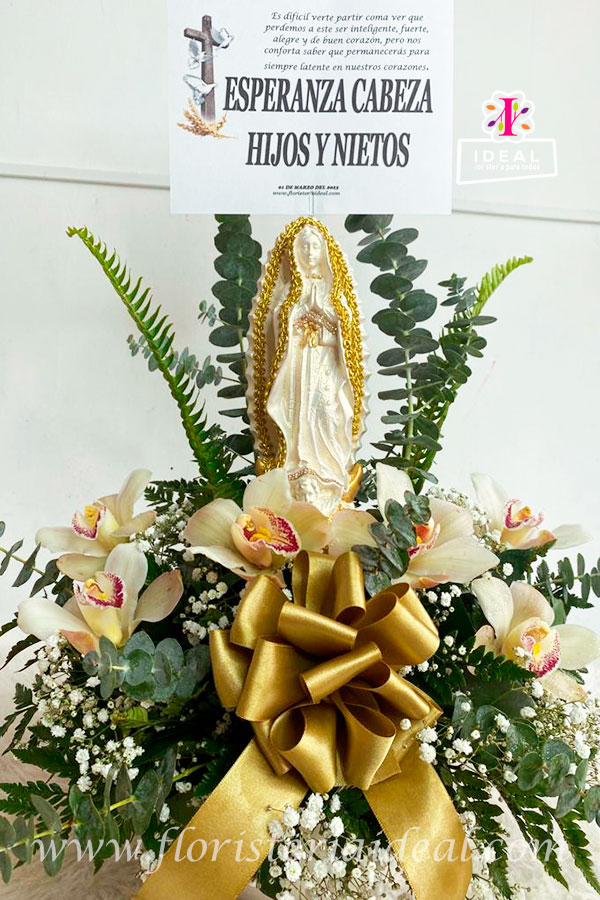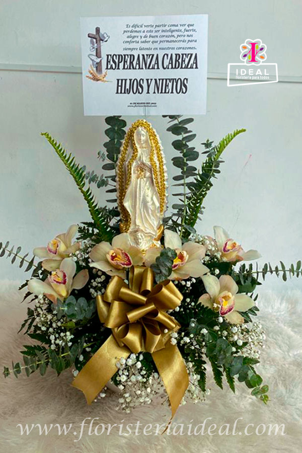 Hermoso arreglo floral de condolencias , elaborado con sinbidios ,follajes e imagen de la virgen ade
