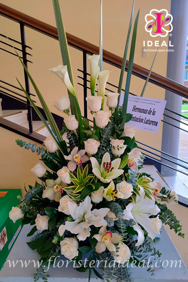 Expresa tus condolencias, lindo ramo elaborado en orquideas, lirios, rosas y follajes verdes, con tarjeta personalizada